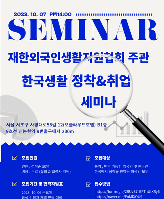 | (공지) 재한외국인생활지원협회 주관 한국생활 정착&취업 세미나 2023.10.07 PM14:00 |